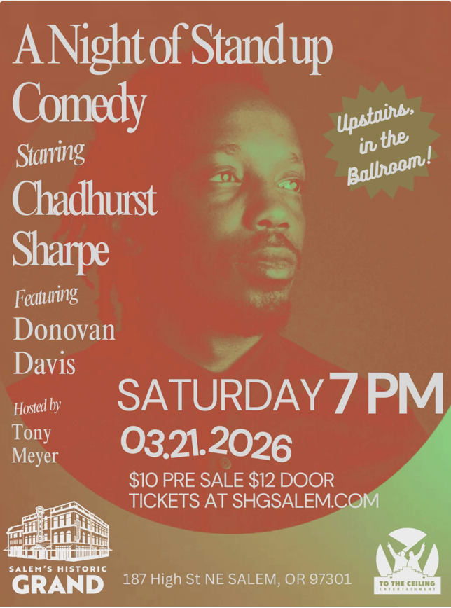 Join host Tony Meyer for a night of high-quality, laugh-out-loud standup comedy in the gorgeous and intimate Grand Ballroom! Featuring Donovan Davis and Chadhurst Sharpe of Eugene, OR, this show will give your weekend just the boost you're looking for.
