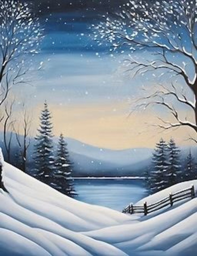 FUN Paint-Party for All Ages - No experience required - All supplies included - Fun guaranteed! Painting "Winter View" [Note: this is the inspiration for the painting I'll be creating] - Use Website Link for More Info & to Register.