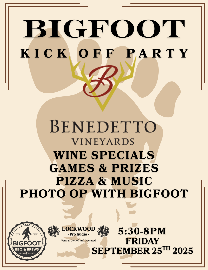 Hosted by Benedetto Vineyard, this is a kickoff event for Bigfoot BBQ & Brews in the Dallas City Park. Live music, award winning wine, pizza (limited supply), and BIGFOOT!