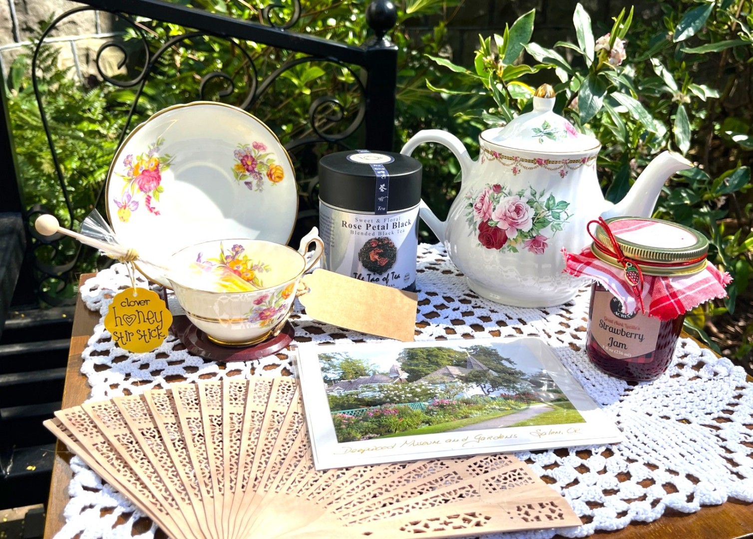 Come shop in the Solarium off of Deepwood’s front porch for teacups, jams, hankies, vintage pieces, tussie mussies, earrings, and more!