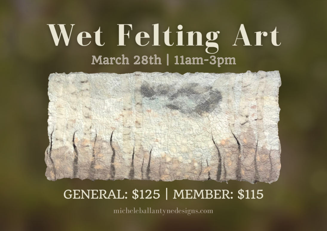 Michele Ballantyne is coming back to teach you wet felting techniques and guide you through creating your very own work of felt art! Wet felting can be done by anyone and is a fun, creative, interactive way to recreate the world around you in an abstract way. The design can be up to 320 square inches, whether that be in a square, rectangle, or multiple smaller designs. Makes a great gift, or activity! Michele will supply all the wool for felting in a large of assortment of colors, as well as silk gauze, other decorative fibers, and yarns that can be added then, or later on! Come create a beautiful felt wall art for your home!