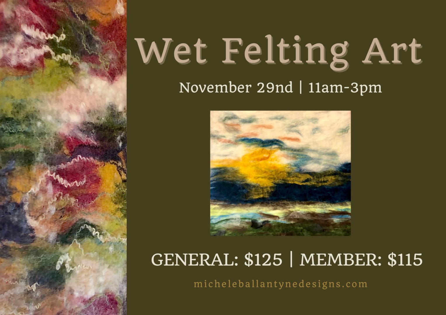 Michele Ballantyne is coming back to teach you wet felting techniques and guide you through creating your very own work of felt art! Wet felting can be done by anyone and is a fun, creative, interactive way to recreate the world around you in an abstract way. The design can be up to 320 square inches, whether that be in a square, rectangle, or multiple smaller designs. Makes a great gift, or activity! Michele will supply all the wool for felting in a large of assortment of colors, as well as silk gauze, other decorative fibers, and yarns that can be added then, or later on! Come create a beautiful felt wall art for your home!