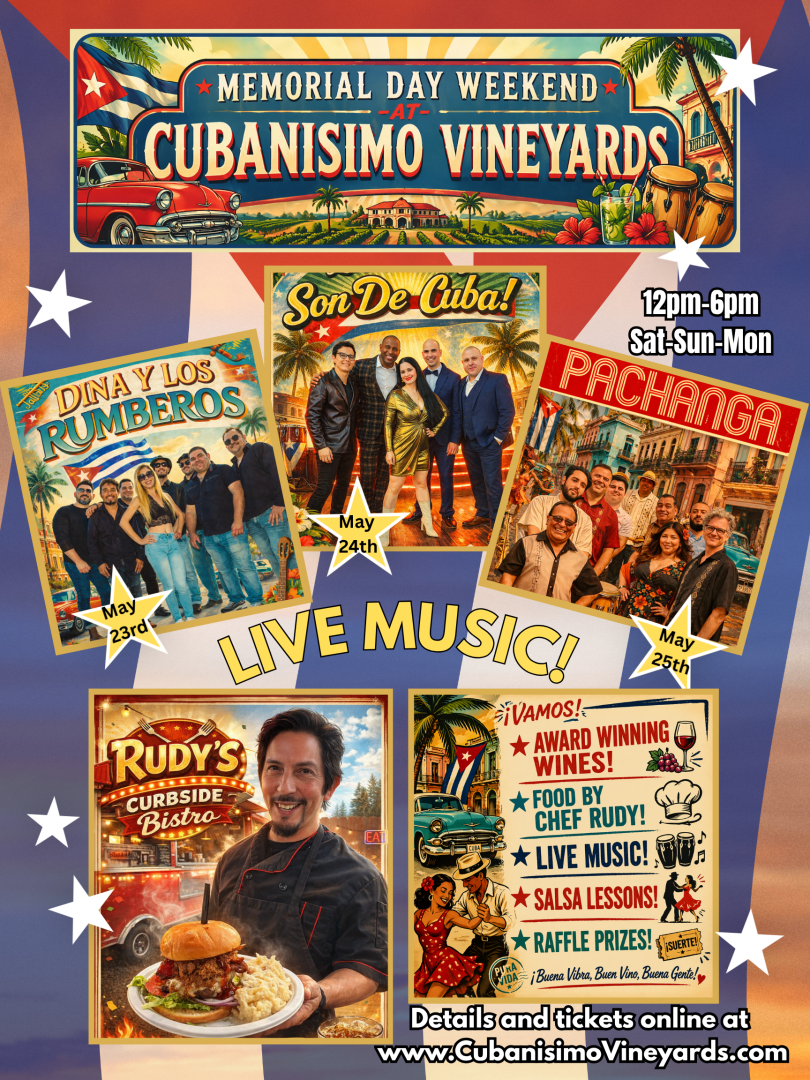We're spicing up Memorial Day Weekend with 3 days of LIVE music, (SALSA dancing, anyone?) amazing views, award winning wines, and delicious food! Details and tickets online at www.CubanisimoVineyards.com!