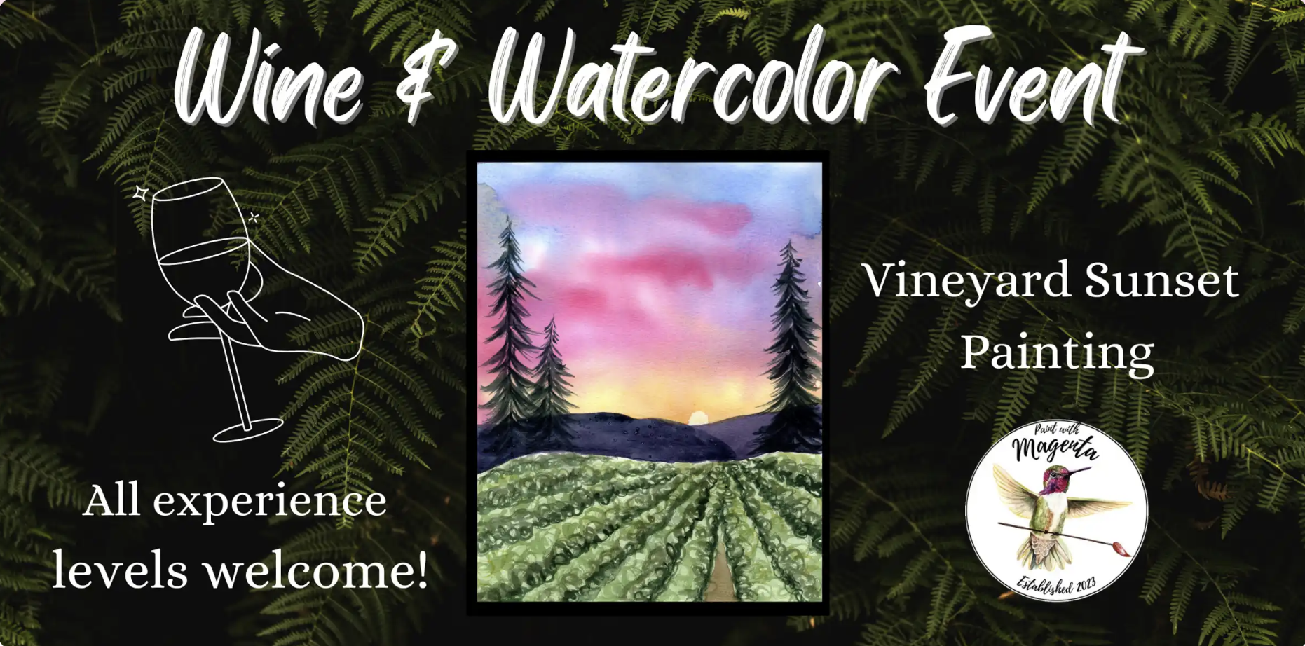 Tap into your inner artist while savoring exquisite wines at RH Estate Wines at Redhawk Vineyard. Whether you're an experienced artist or a complete beginner, this event promises a fun, no-pressure environment to create beautiful watercolor masterpieces while enjoying the finest local wines. We’ll be creating a painting of a beautiful sunset over a vineyard.